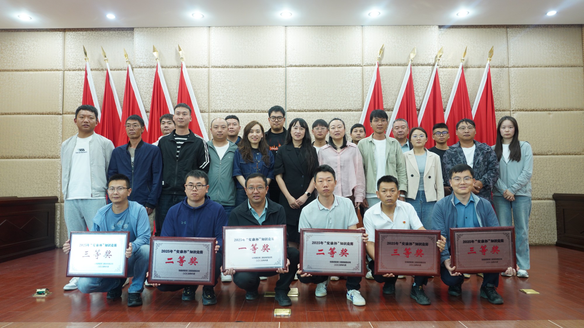 本次竞赛采用集团“云南建投学习成长平台”线上答题形式,旨在以赛促学、以赛促产,提升全员安全生产意识,助推公司项目管理提质增效。比赛中,各参赛队严格遵守竞赛规则,选手们全神贯注、认真答题,展现出了扎实的安全生产知识功底与严谨的比赛态度。经过激烈的角逐,最终有6支队伍脱颖而出。第十二直管部荣获一等奖,第九直管部、市政分公司摘得二等奖,第一直管部、第六直管部、第七直管部获得三等奖。公司领导分别为获奖队伍颁奖并合影留念。