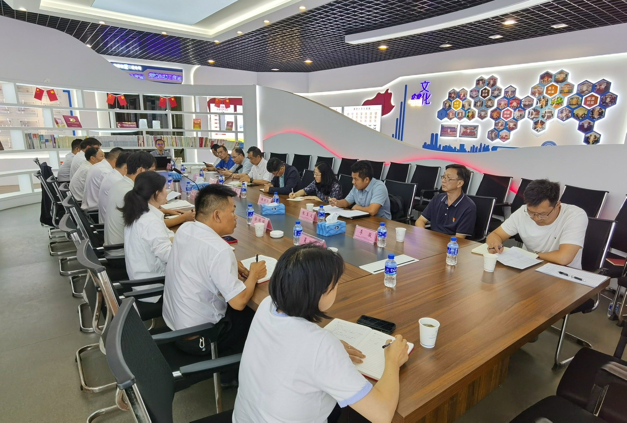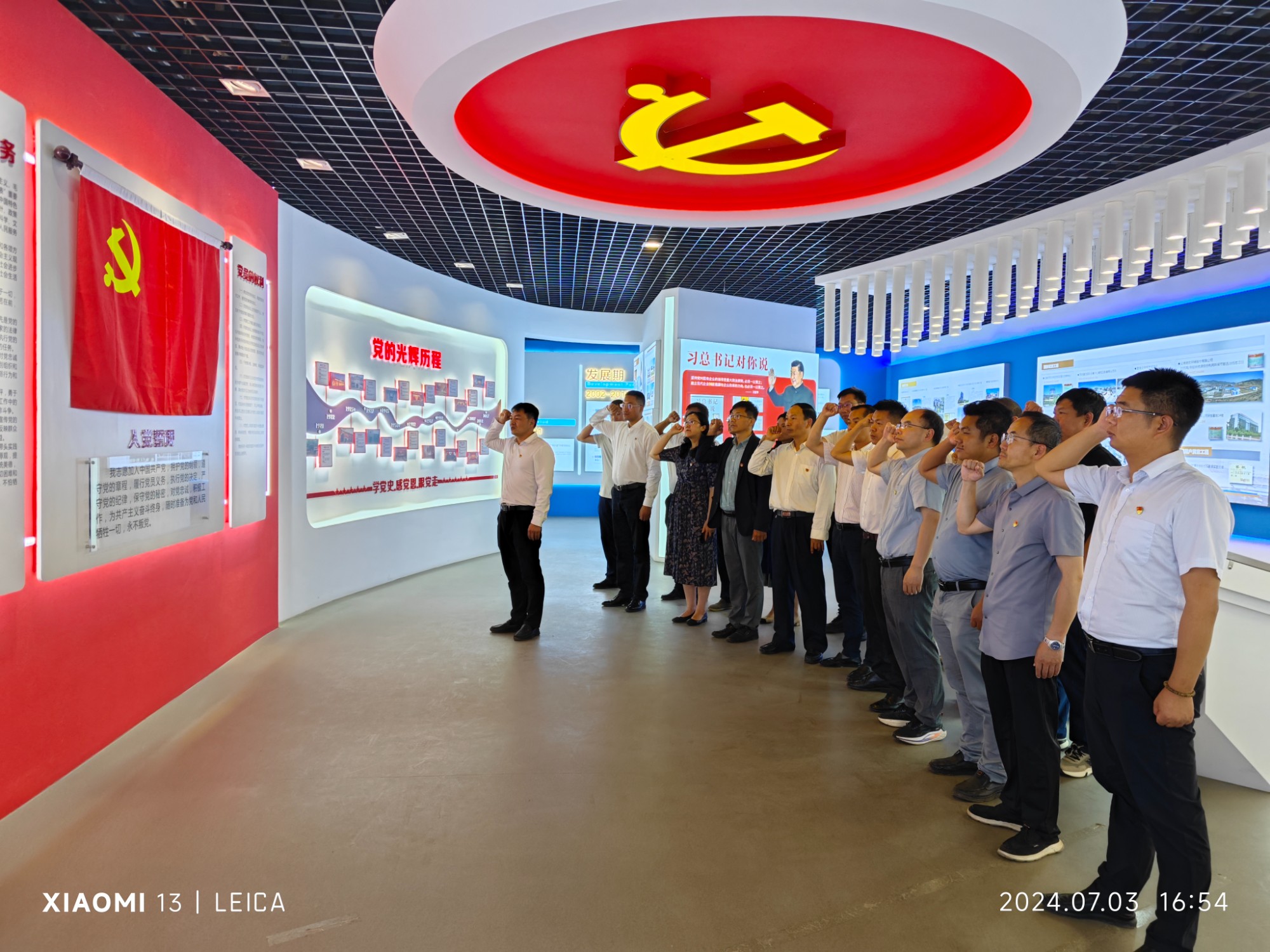 交流结束后,参会人员共同参观了建设产业化分公司党员活动阵地、职工创新工作站、劳模创新工作室及廉洁文化区,并在党旗面前庄重举起右拳,共同重温入党誓词,回顾初心使命。