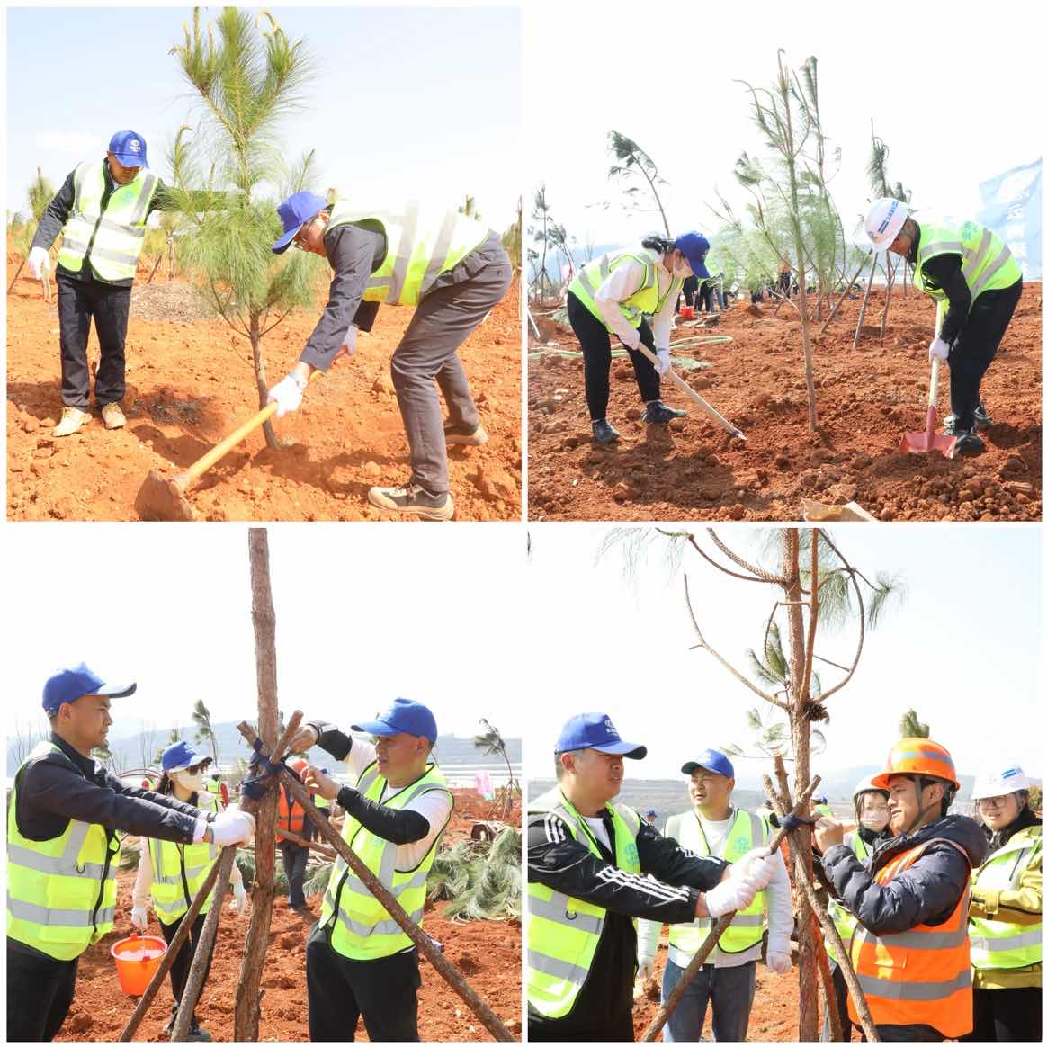 参加活动的干部职工们每六人一组,大家分工有序、协调配合,有的挥锹铲土,有的扶苗填坑,有的踏土夯苗,一丝不苟地完成每道工序,亲手种下一棵棵象征着希望和未来的树苗。不一会儿,60余棵云南松树苗便迎风挺立,青翠的绿色带来了春天的勃勃生机,装点着被黄土覆盖的山坡。