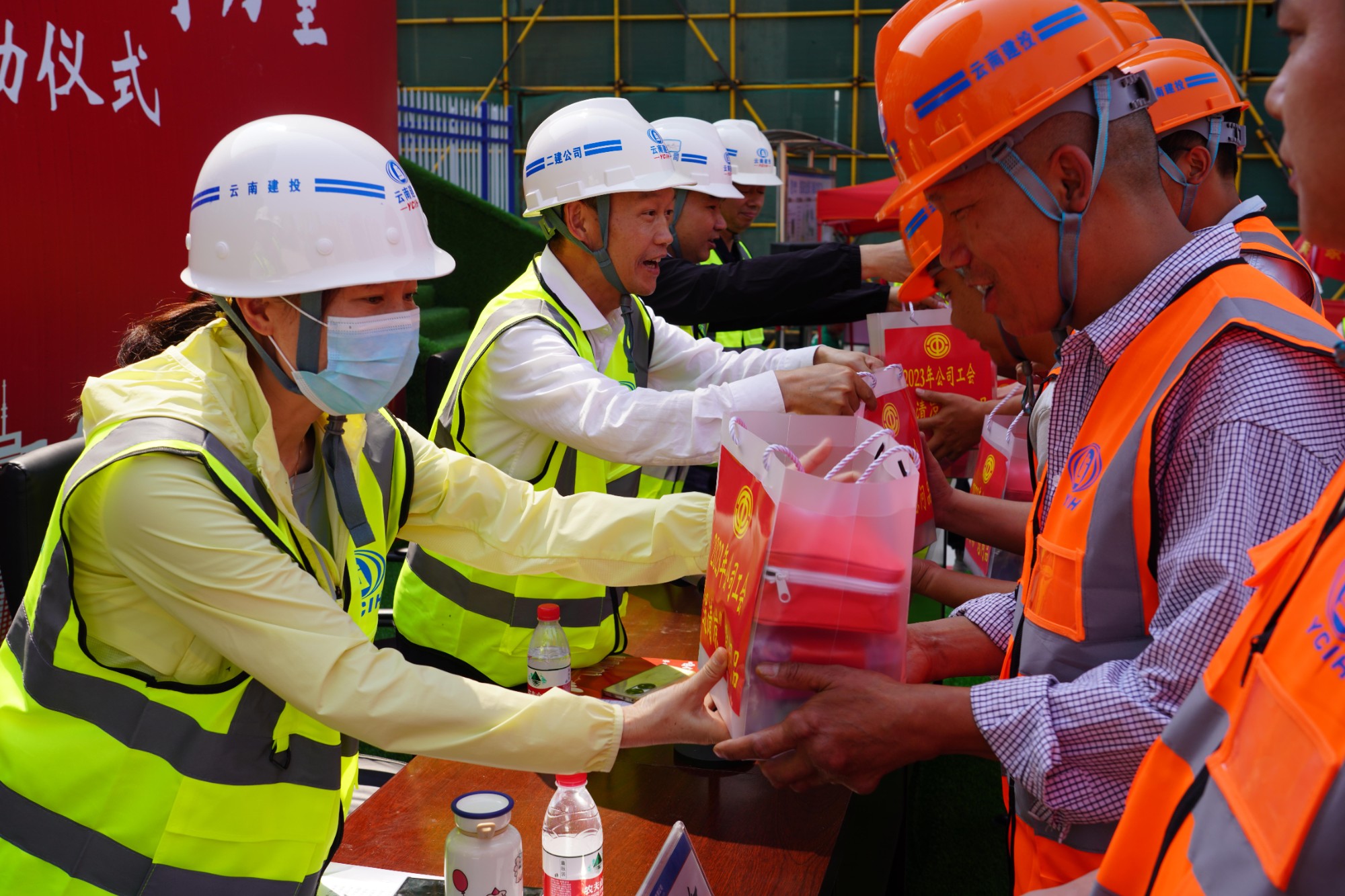 仪式上组织了劳模宣讲活动,公司劳?;铺熘凑杖芑?、云南省总工会相关要求,代表广大产业工人,结合自身工作经历,讲述了产业工人奋斗故事,弘扬了劳模精神、劳动精神、工匠精神。参会领导为劳动竞赛参赛单位以及青年突击队代表授旗,劳动竞赛参赛项目代表、获奖代表分别作了表态发言,同时启动公司2023年“夏送清凉”慰问活动,为项目部及产业工人代表送上了慰问品。