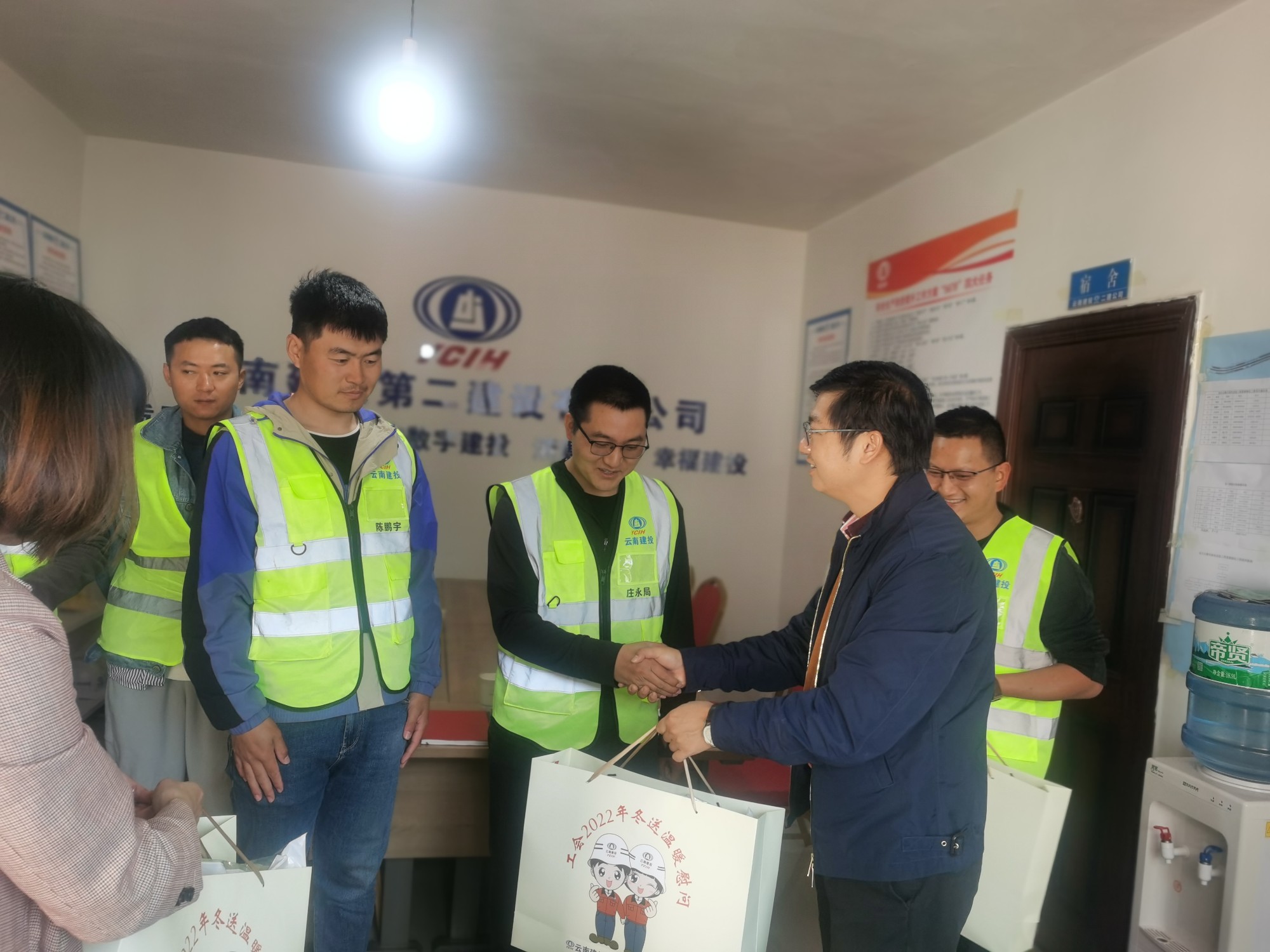 会后,万向遵与项目一线职工亲切交谈,并为他们送上公司党政领导的关怀及防寒慰问品。