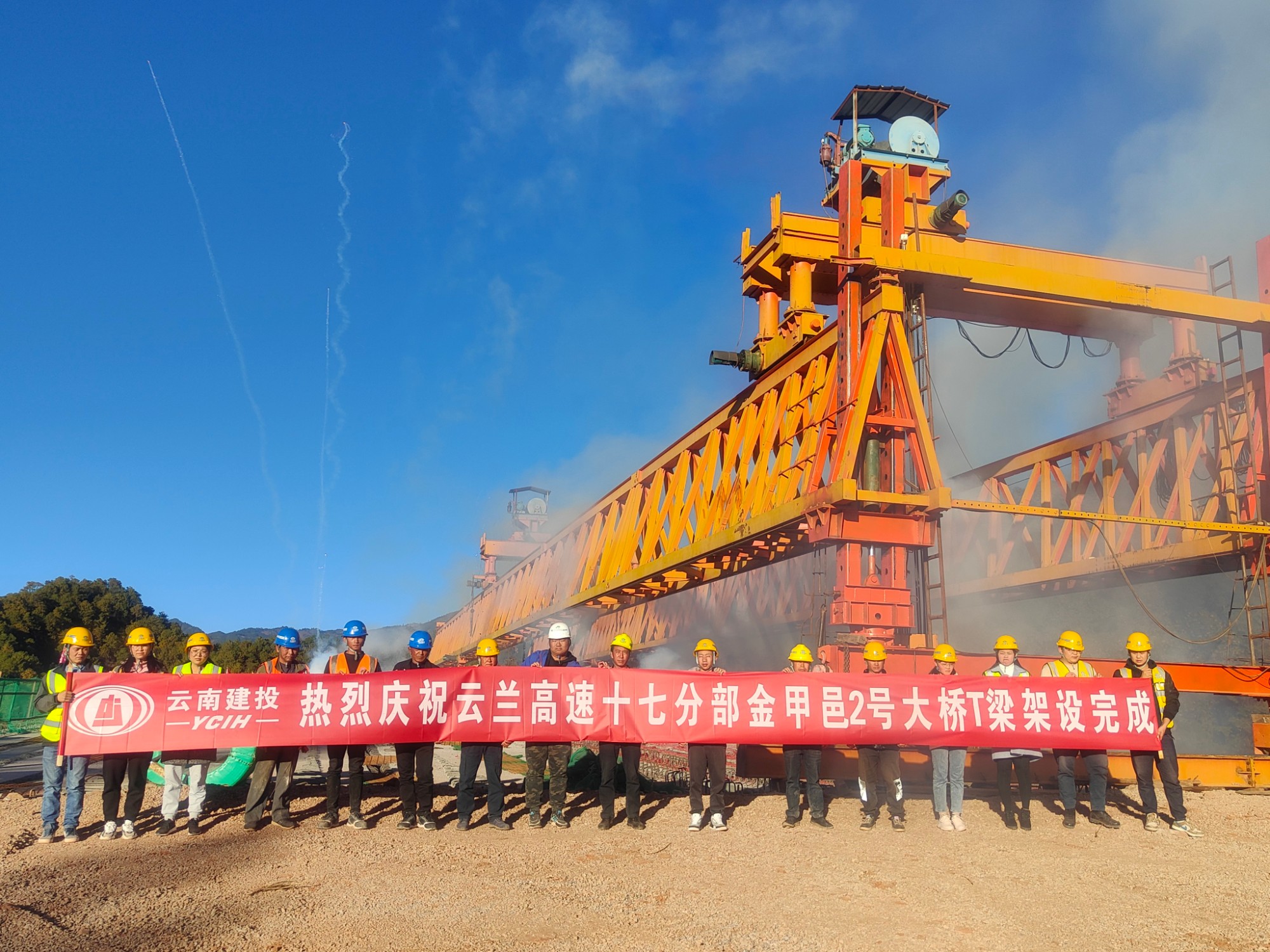11月22日下午,在清脆悠长的鞭炮声中,金甲邑2号大桥最后一片40米T梁稳稳落下,由路桥分公司承建的云兰高速土建十七分部金甲邑2号大桥40米T梁全部架设完成,为节点工期的顺利完成奠定了坚实基础。