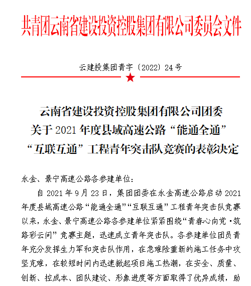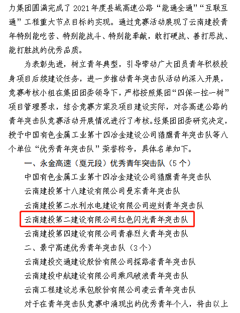 6月13日,集团团委下发了《关于2021年度县域高速公路“能通全通”“互联互通”工程青年突击队竞赛的表彰决定》公司第十九直管部永金高速红色闪光青年突击队赫然在列,在本次考核中,红色闪光青年突击队以考核第四名的成绩获评集团团委永金高速优秀青年突击队。