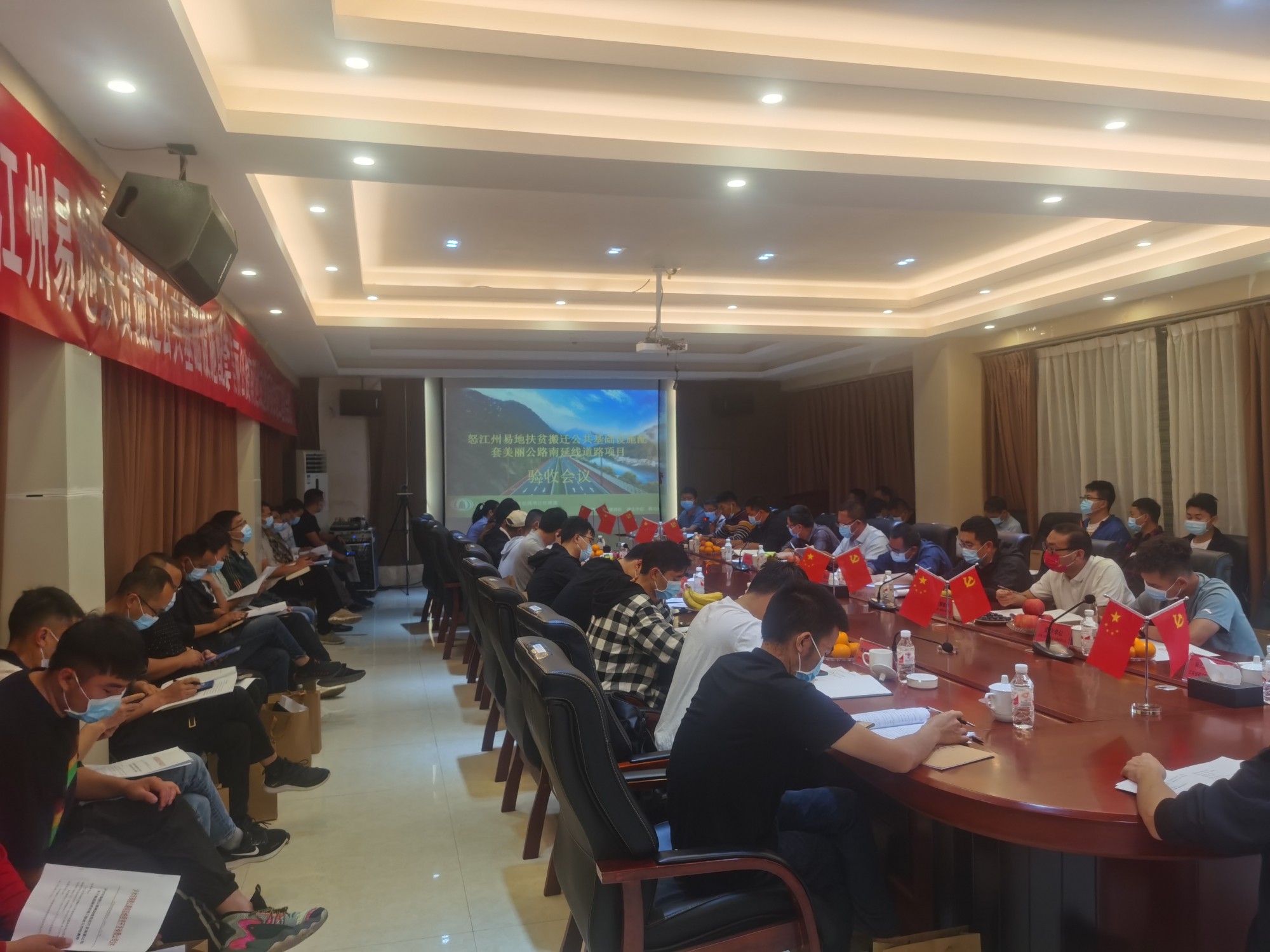泸水市美丽公路南延线投资开发有限公司组织各方参建单位(建设、监理、设计、第三方检测、造价、勘察、施工及监督单位)进行竣工验收。验收现场,施工单位对工程完成情况进行介绍,验收组根据验收方案分成内业组、外业组、综合组,划定各小组检查点和检查路线,由外业组带领各方参建人员及质量监督单位进行了现场质量控制及验收,再由内业组带领各方参建人员及质量监督单位负责人对内业资料进行了核查评定与意见签署,各个小组人员各司其职、相互配合。