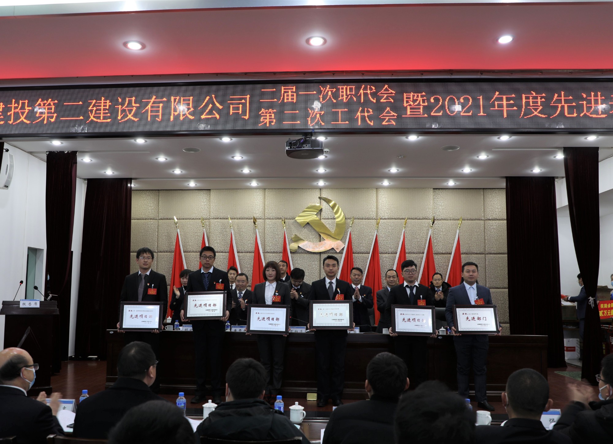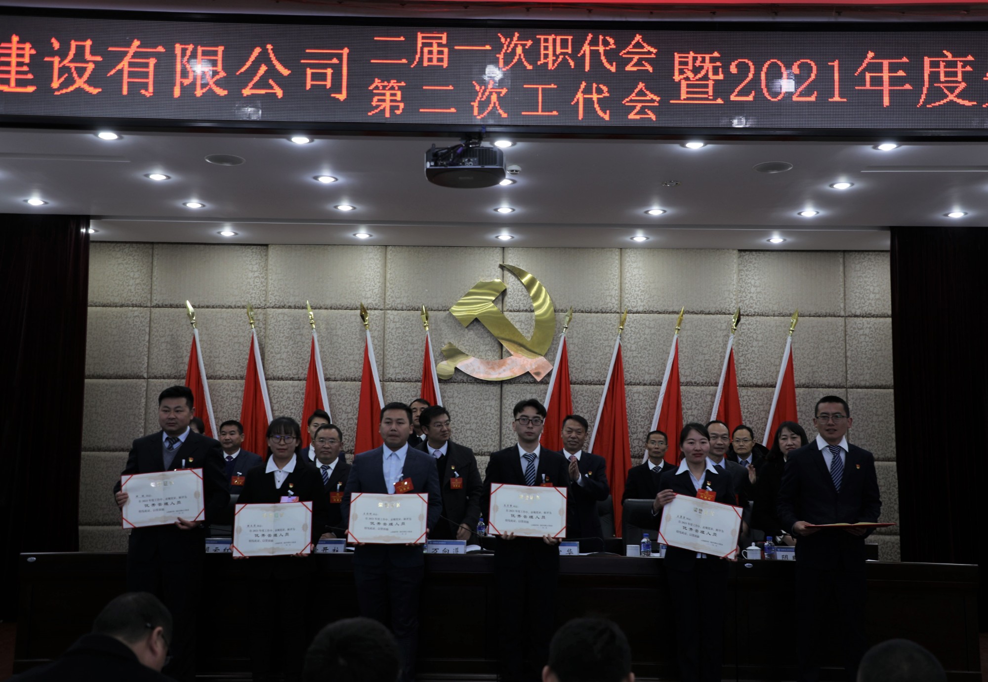 会议表彰了2021年度先进集体、先进工作者、优秀岗位能手及先进农民工班组、优秀农民工;2021年度优秀项目经理;2021年度优秀管理人员;2021年度先进工会、优秀工会干部、支持工会工作的党政领导、工会积极分子以及2020年通过执(职)业资格考试、2021年通过会计师考试人员。先进单位代表、先进项目部代表、优秀工会干部以及年轻干部代表作了交流发言。