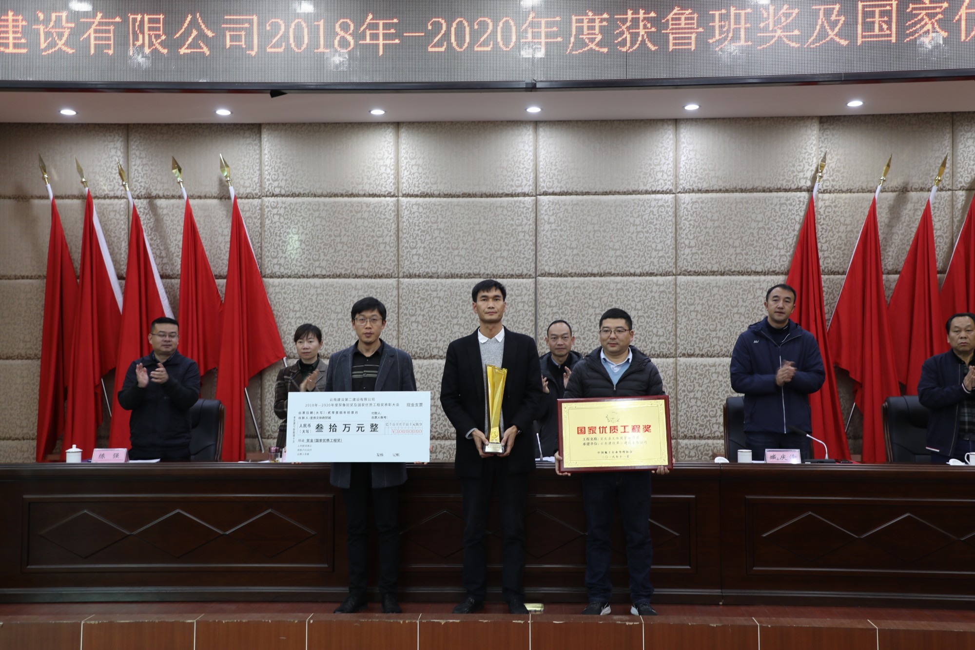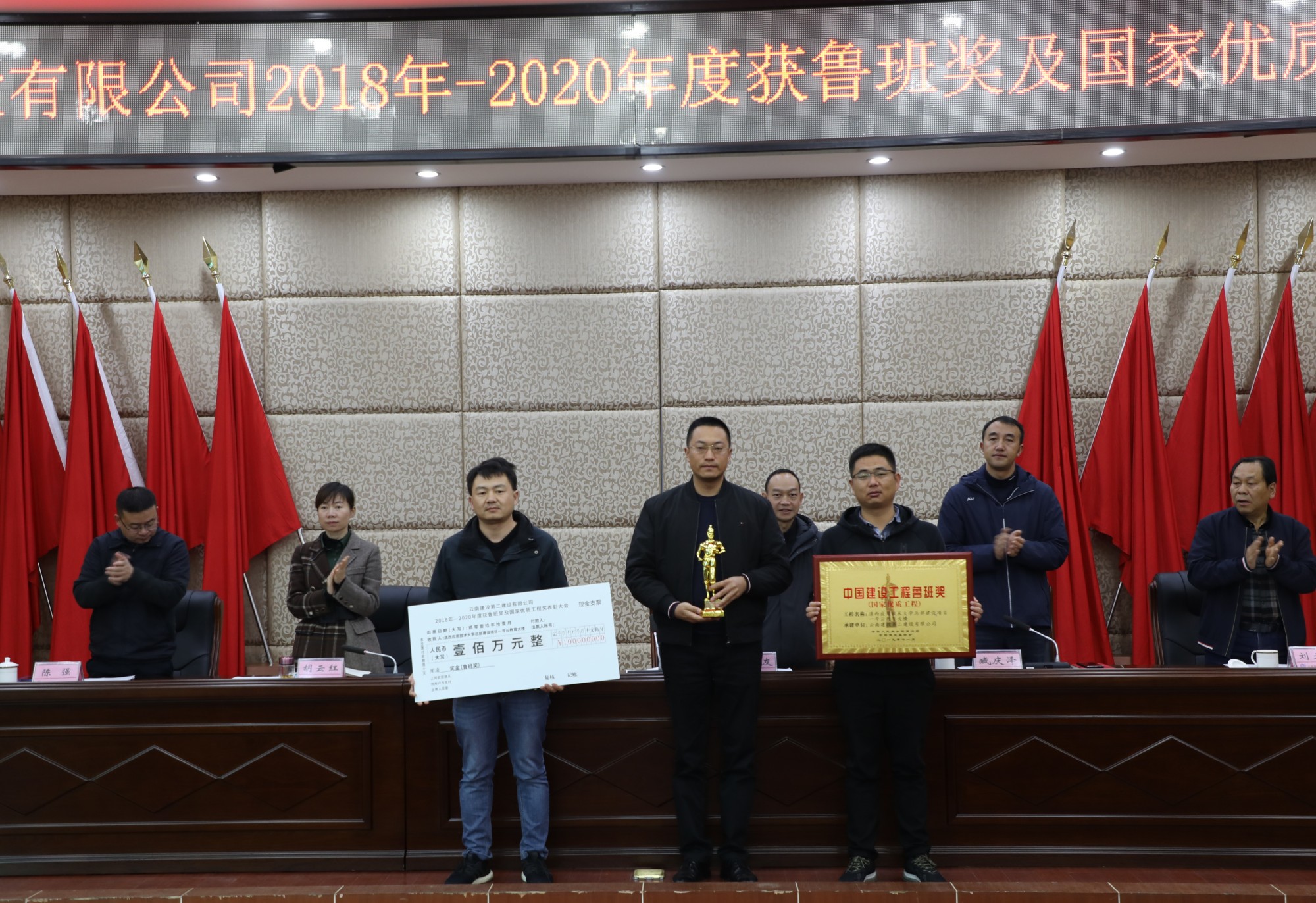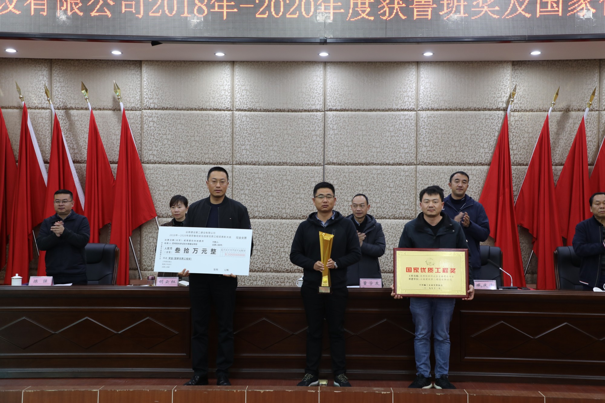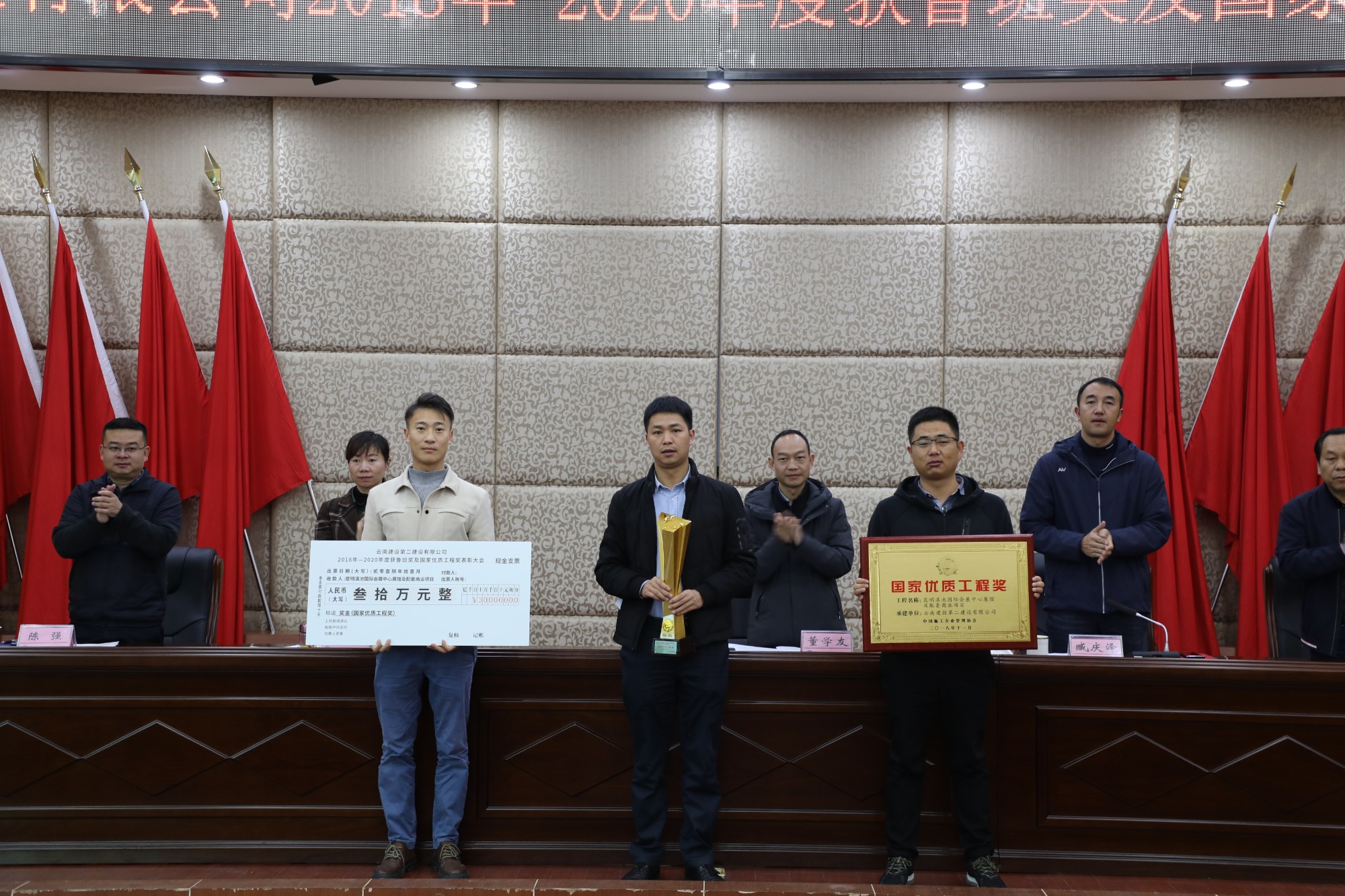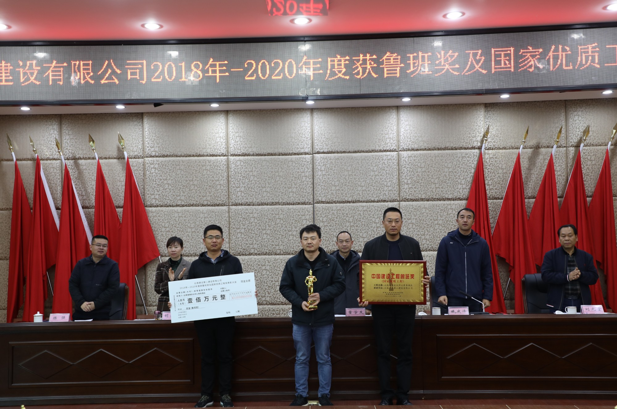 董学友代表公司领导班子对获奖的单位表示祝贺和感谢,并指出,“十三五”期间,公司在生产、经营管理工作保持良好发展势头的同时,质量创优工作稳步推进、精心组织、全面策划,不仅圆满完成了2018-2020年度制定的质量创优指标,质量创优奖项也再创历史新高,取得了可喜的成绩。公司2018-2020年共获得鲁班奖3项(云南海埂会议中心商务酒店、滇西应用技术大学总部建设项目一号云教育大楼、楚雄市政务服务中心)、国家优质工程奖3项(宜良文体商贸城、昆明滇池国际会展中心展馆及配套商业项目、昆明院科研实验大楼建设项目)。根据公司《技术质量管理手册》中《工程项目创优奖励制度》的规定及公司《关于2018-2020年度鲁班奖、国家优质工程奖的决定》。公司对获奖项目,和主要完成单位(第一直管部、第二直管部、第九直管部、第十三直管部、第十五直管部、第一安装分公司和第二安装分公司)进行表彰,对各获奖基层单位依照文件规定颁发相应的奖励。希望获奖单位戒骄戒躁,继续发扬工匠精神,为公司创建更多精品工程。