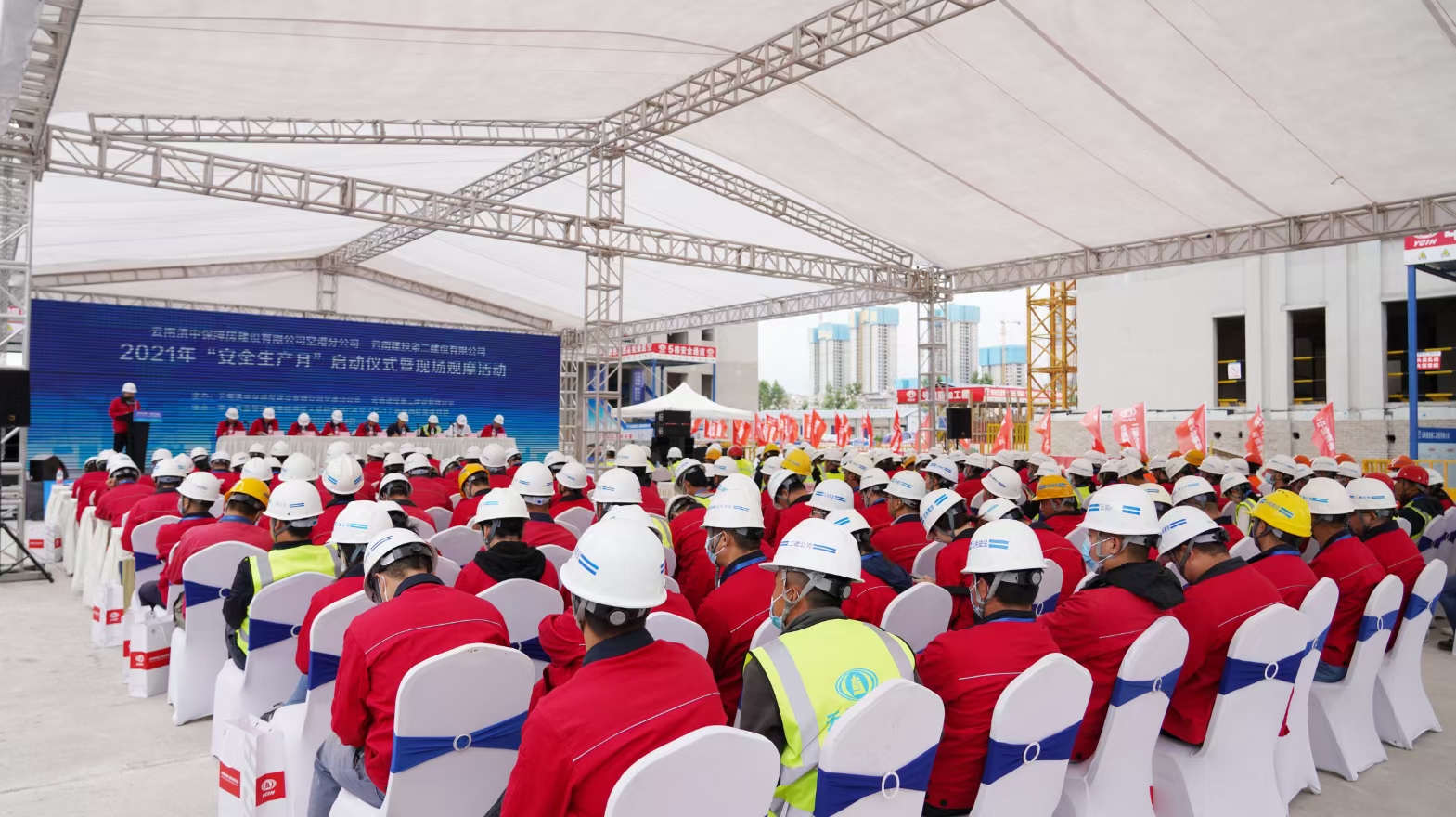 与会领导有:云南滇中保障房建设有限公司总经理茶本伟,安全总监、工程部经理刘崇华,空港分公司总经理陈云,公司党委委员、工会主席胡云红,公司党委委员、副总经理董学友,副总经理臧庆泽,总经理助理、第十五直管部经理李勇。公司各职能部门、各基层单位代表,云南滇中保障房有限公司空港分公司及空港分公司各参建代表,农民工代表,项目职工代表参与启动仪式。仪式由公司安全总监罗雪刚主持。