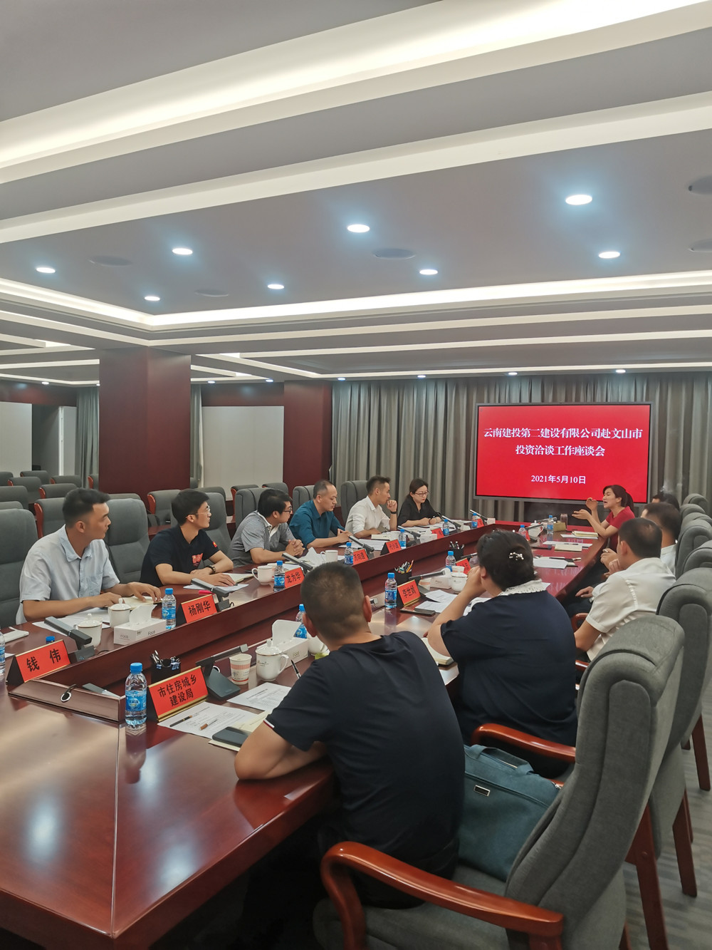 5月10日,公司与城乡投公司一行赴文山市洽谈项目合作。文山州州委常委、市委书记李永忠,市委常委李世嫣,市人民政府副市长邓月文、金梅,公司党委书记、副董事长万向遵,年轻副总经理、项目总承包部负责人龙为华,云南省城乡建设投资有限公司滇南区域公司党支部书记代小波一行参加会议,会议由李永忠主持。